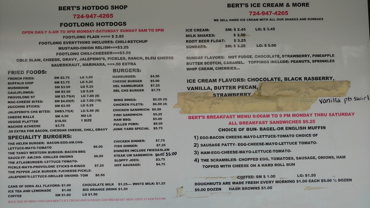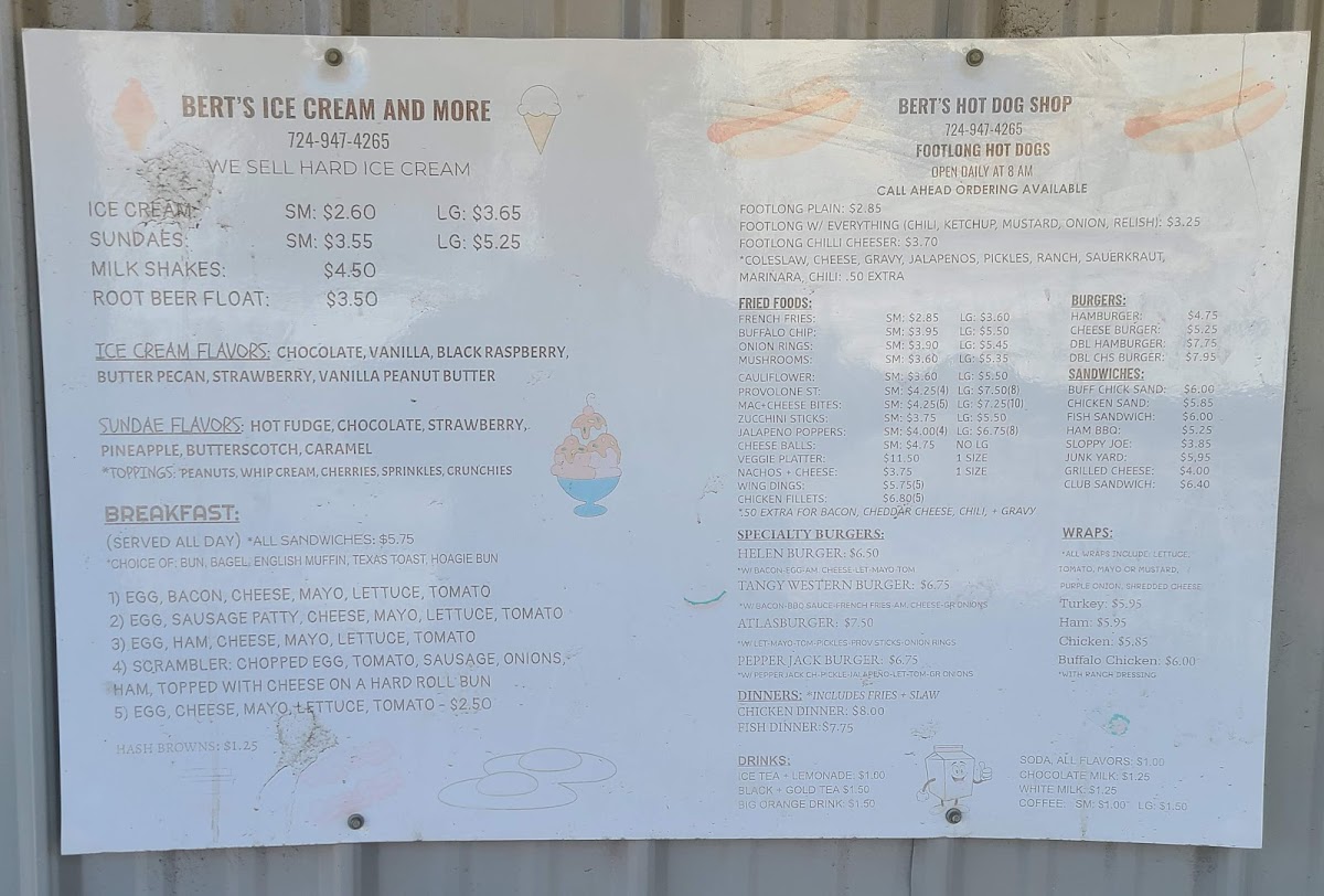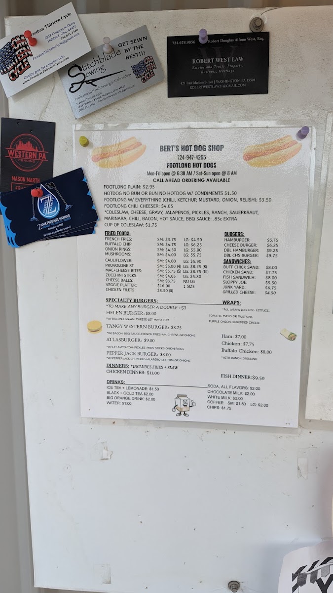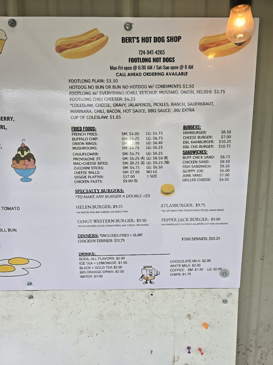 Bert's Hot Dog Shop in Burgettstown offers a diverse menu that caters to all tastes, with options ranging from hearty breakfasts to indulgent desserts. For breakfast, guests can enjoy a variety of sandwiches like the Egg, Bacon, Cheese Sandwich for $8.75 or the Scrambler for $9.25, a delicious mix of eggs, sausage, ham, onions, and cheese. The shop’s selection of footlong hot dogs includes classic options like the Footlong Plain for $3.10 and the Footlong Chili Cheeser for $4.25, perfect for those craving a savory snack. Fried food lovers can dig into French Fries starting at $4.00, or try more unique sides like Mac + Cheese Bites for $6.25 or Provolone Sticks for $5.25. For heartier meals, the Chicken Dinner for $11.75 and Fish Dinner for $10.25 are popular choices, each served with fries and coleslaw. Bert’s also boasts a variety of specialty burgers like the Helen Burger for $9.25, which includes bacon, egg, and American cheese, and the Tangy Western Burger for $9.50, topped with BBQ sauce and French fries. If you're in the mood for something lighter, the Buff Chick Sand for $8.75 or the Fish Sandwich for $8.50 are perfect. For a sweet finish, indulge in a Milk Shake for $5.95 or a Root Beer Float for $5.65, alongside classic ice cream options starting at $3.95. Bert’s offers something for everyone, making it a great spot for a casual meal or a snack on the go.