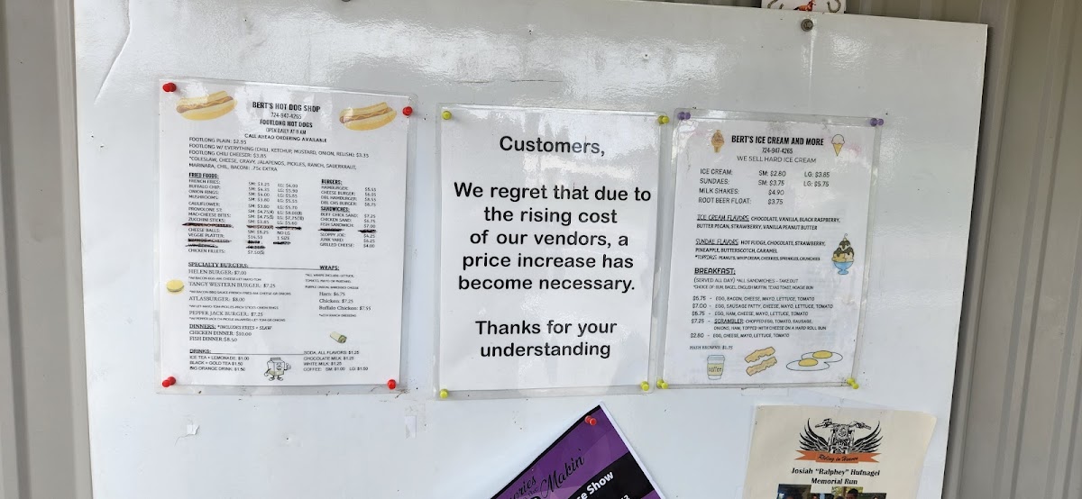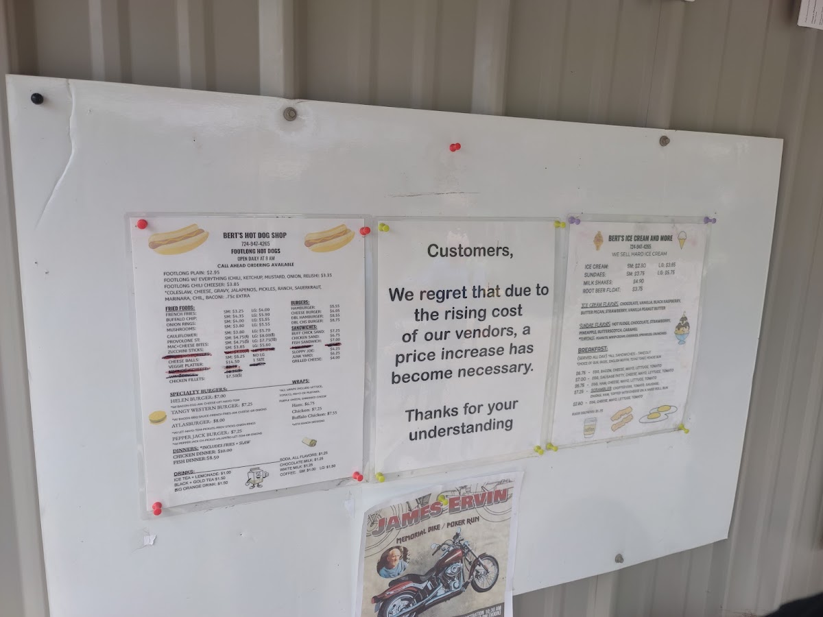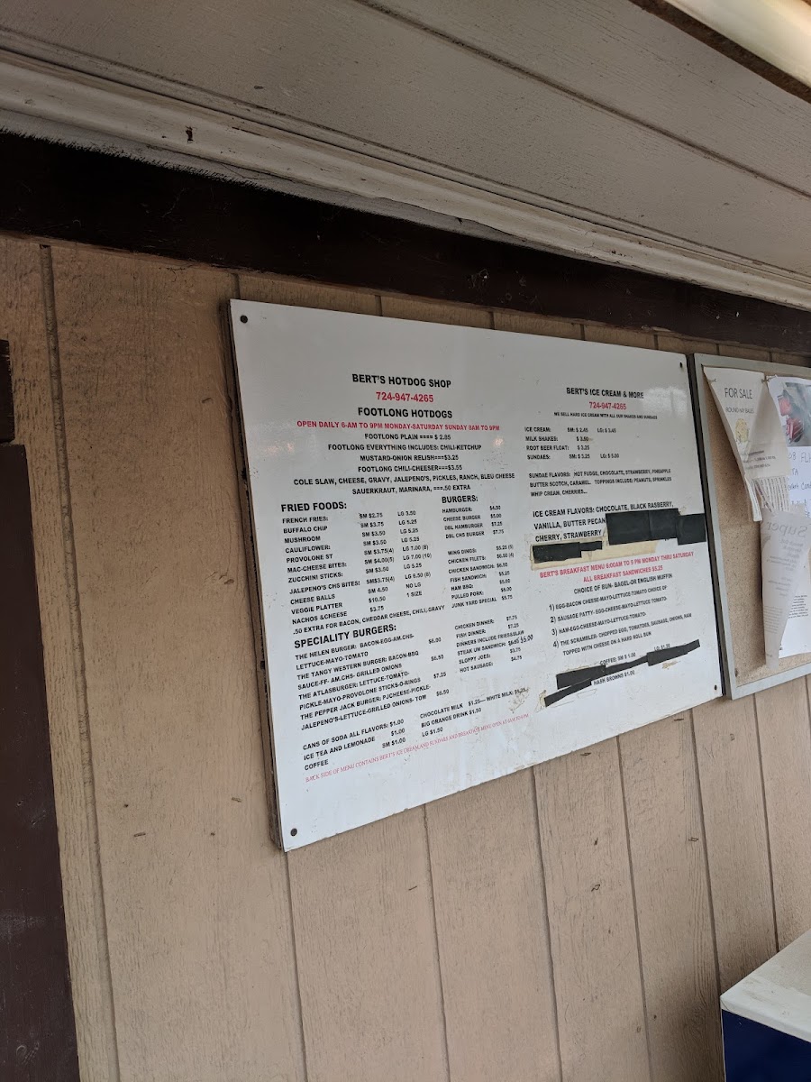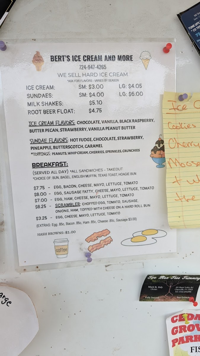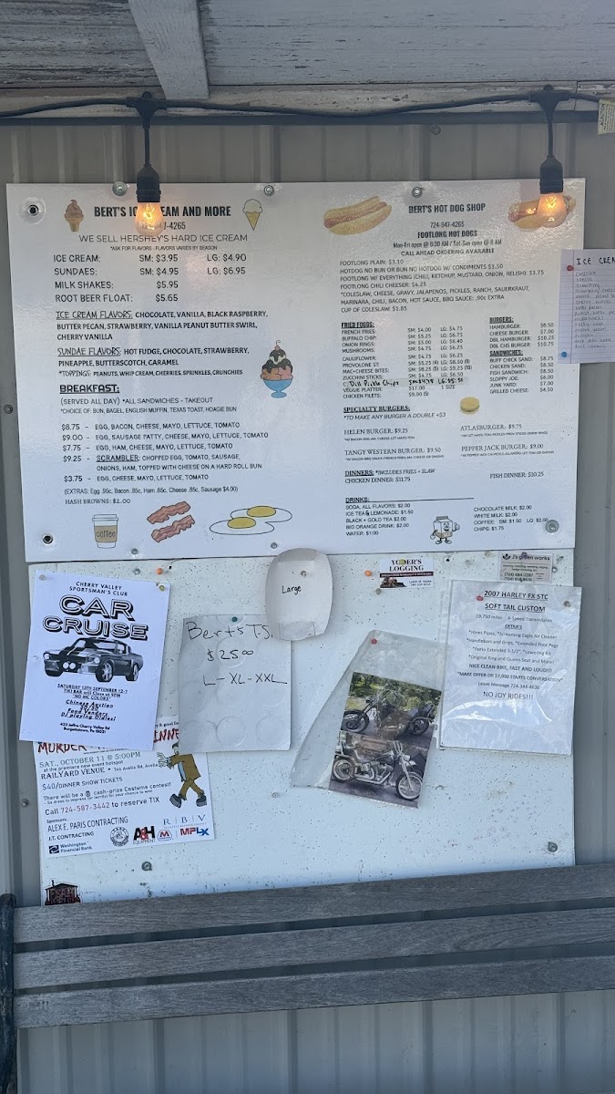 Bert's Hot Dog Shop in Burgettstown offers a diverse menu that caters to all tastes, with options ranging from hearty breakfasts to indulgent desserts. For breakfast, guests can enjoy a variety of sandwiches like the Egg, Bacon, Cheese Sandwich for $8.75 or the Scrambler for $9.25, a delicious mix of eggs, sausage, ham, onions, and cheese. The shop’s selection of footlong hot dogs includes classic options like the Footlong Plain for $3.10 and the Footlong Chili Cheeser for $4.25, perfect for those craving a savory snack. Fried food lovers can dig into French Fries starting at $4.00, or try more unique sides like Mac + Cheese Bites for $6.25 or Provolone Sticks for $5.25. For heartier meals, the Chicken Dinner for $11.75 and Fish Dinner for $10.25 are popular choices, each served with fries and coleslaw. Bert’s also boasts a variety of specialty burgers like the Helen Burger for $9.25, which includes bacon, egg, and American cheese, and the Tangy Western Burger for $9.50, topped with BBQ sauce and French fries. If you're in the mood for something lighter, the Buff Chick Sand for $8.75 or the Fish Sandwich for $8.50 are perfect. For a sweet finish, indulge in a Milk Shake for $5.95 or a Root Beer Float for $5.65, alongside classic ice cream options starting at $3.95. Bert’s offers something for everyone, making it a great spot for a casual meal or a snack on the go.